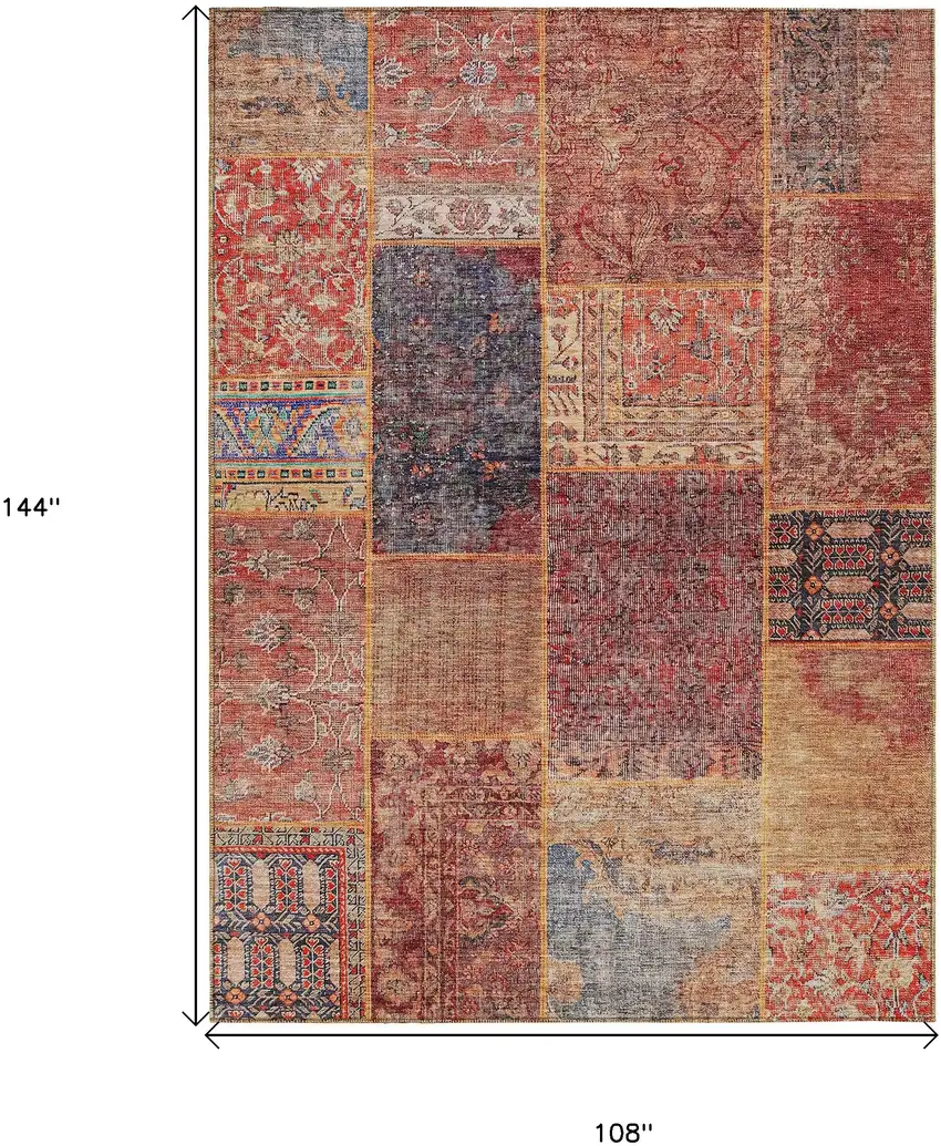 This 9-foot x 12-foot red orange and blue patchwork washable indoor outdoor area rug, is a great way to add warmth to a room. This rectangle shaped rug features a patchwork design that will work well both indoors or out. A classic shape marries with good looking design for your living room, hall, bedroom, porch, patio, or poolside. Ideal for outdoor spaces or high traffic areas with kids and pets, this rug is made from heavy duty polyester that is stain resistant to help repel water, dirt, and stains. Versatile in use, durable, and easy to maintain, this rug is an ideal solution to add a decorative and inviting touch to your indoor or outdoor space. 108-inch h x 144-inch w x 0.19-inch d.