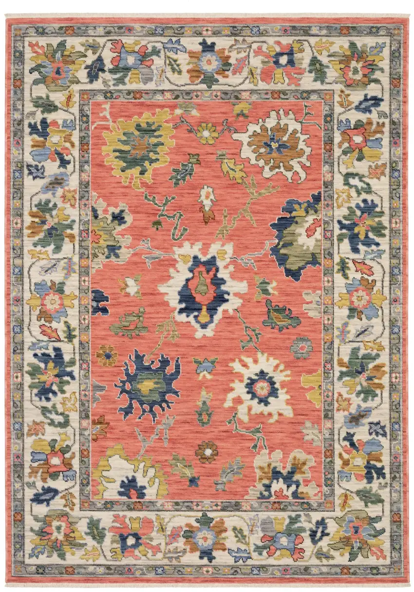 Salmon Blue And Yellow Oriental Area Rug With Fringe