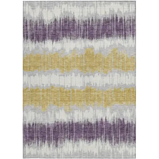 Add great coloration and comfortable texture to your space with this 9-foot x 12-foot silver ivory and purple striped washable indoor outdoor area rug. This rectangle shaped rug features a striped design that will work well both indoors or out. A classic shape marries with good looking design for your living room, hall, bedroom, porch, patio, or poolside. Ideal for outdoor spaces or high traffic areas with kids and pets, this rug is made from heavy duty polyester that is stain resistant to help repel water, dirt, and stains. Versatile in use, durable, and easy to maintain, this rug is an ideal solution to add a decorative and inviting touch to your indoor or outdoor space. 108-inch h x 144-inch w x 0.19-inch d.