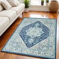 Sky Blue And Ivory Tribal Washable Area Rug With UV Protection