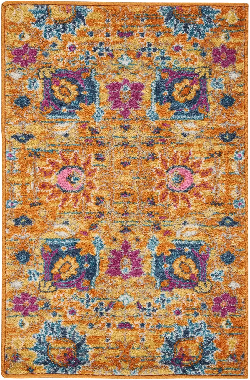 Measuring 2'3" x 3'9", this sun gold and navy distressed scatter rug fits into any space easily. It's the perfect choice for those looking to elegantly fill smaller spaces or add a pop of color to larger rooms.