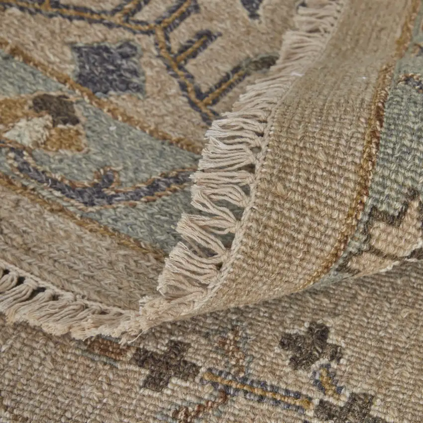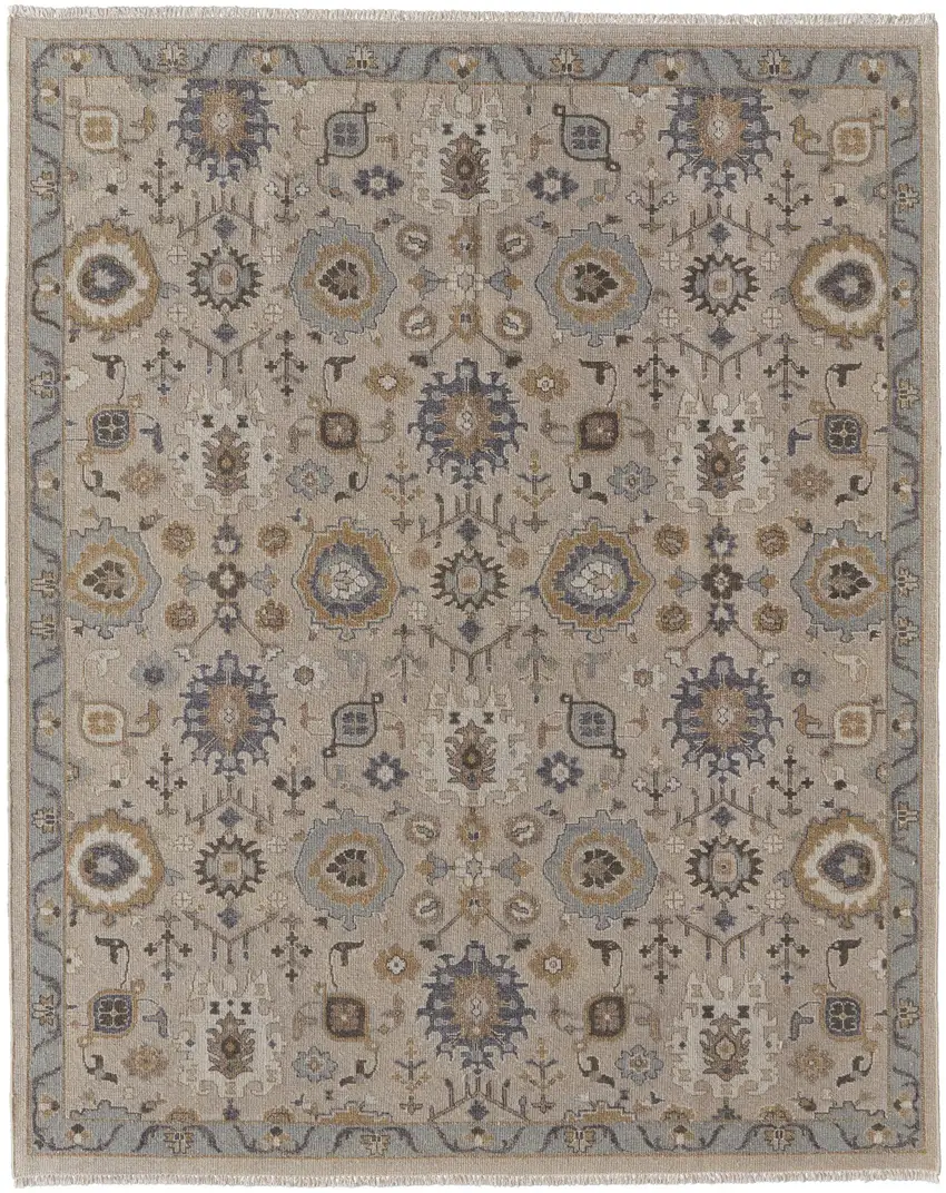 Tan Brown and Gray Wool Oriental Hand Knotted Area Rug With Fringe