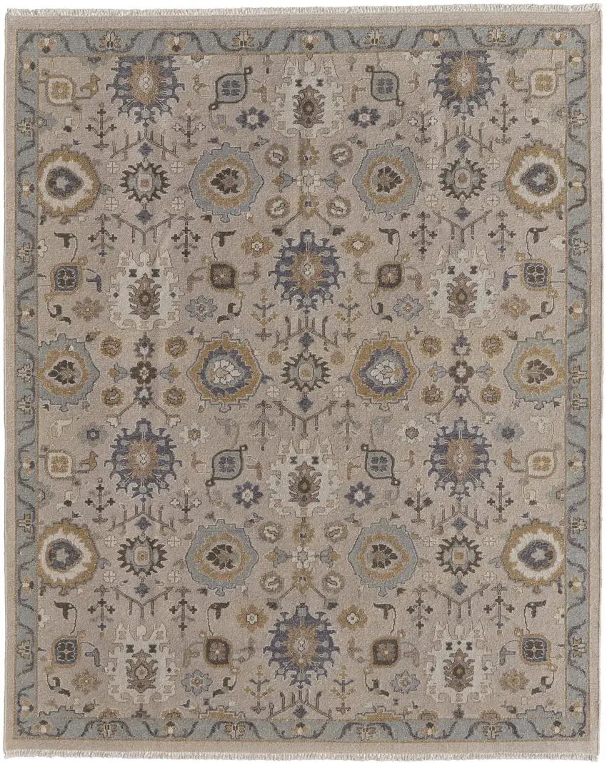Tan Brown and Gray Wool Oriental Hand Knotted Area Rug With Fringe