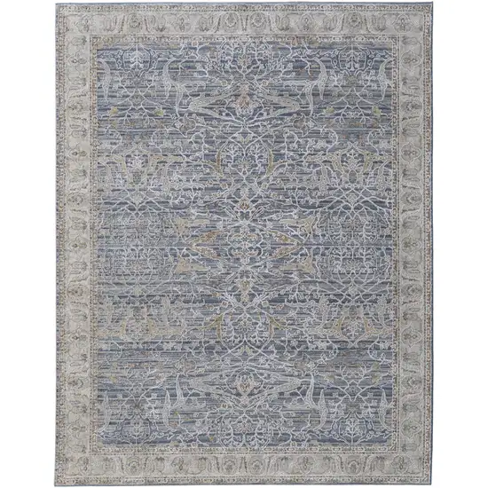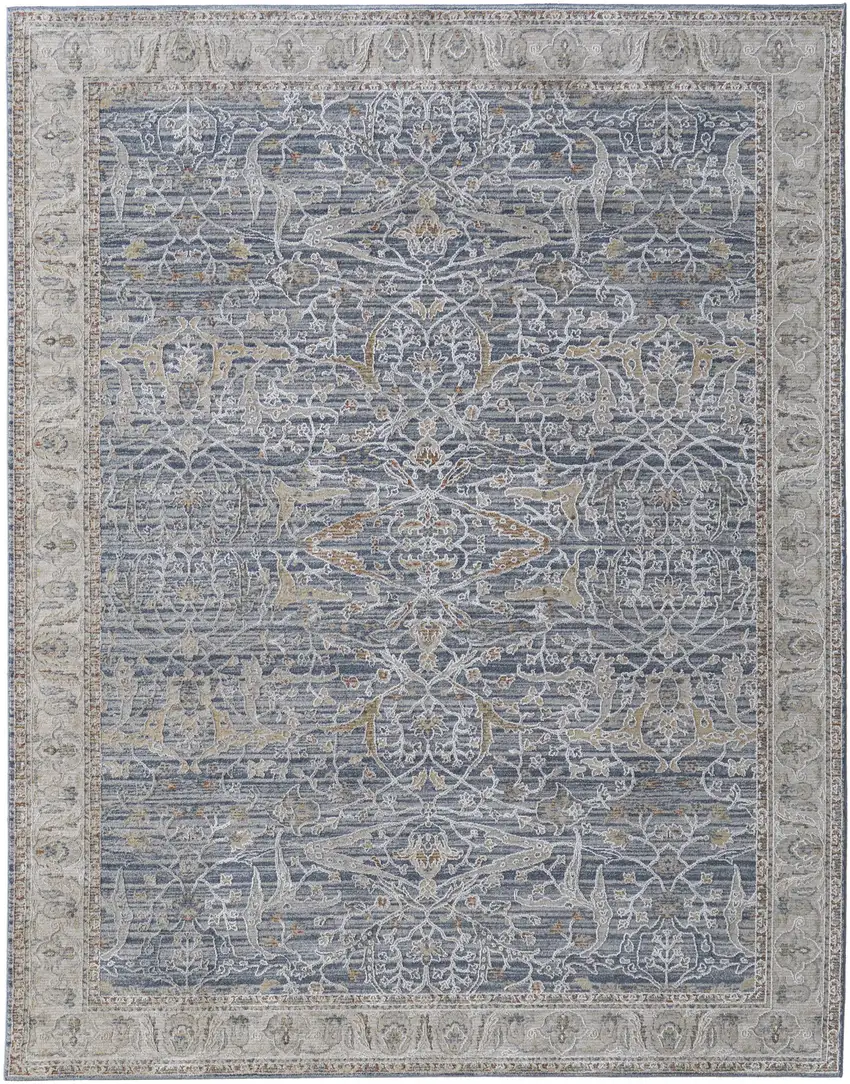 Taupe and Blue Ikat Power Loom Worn Faded Area Rug With Fringe