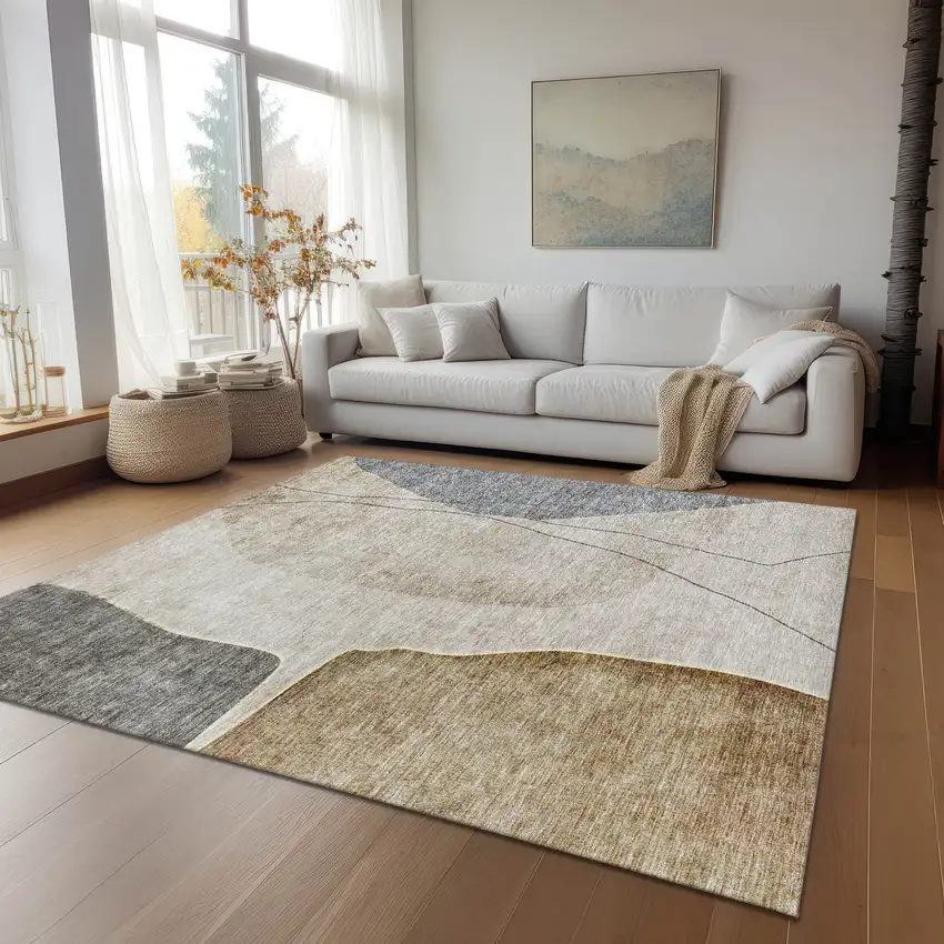 This 9-foot x 12-foot taupe beige and gray abstract washable indoor outdoor area rug, is a great way to add warmth to a room. This rectangle shaped rug features a abstract design that will work well both indoors or out. A classic shape marries with good looking design for your living room, hall, bedroom, porch, patio, or poolside. Ideal for outdoor spaces or high traffic areas with kids and pets, this rug is made from heavy duty polyester that is stain resistant to help repel water, dirt, and stains. Versatile in use, durable, and easy to maintain, this rug is an ideal solution to add a decorative and inviting touch to your indoor or outdoor space. 108-inch h x 144-inch w x 0.19-inch d.