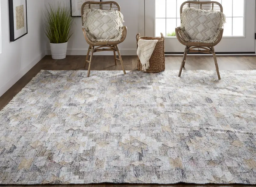 Taupe Gray And Blue Geometric Hand Woven Stain Resistant Area Rug With Fringe