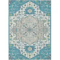 Teal Blue And Ivory Floral Washable Indoor Outdoor Area Rug