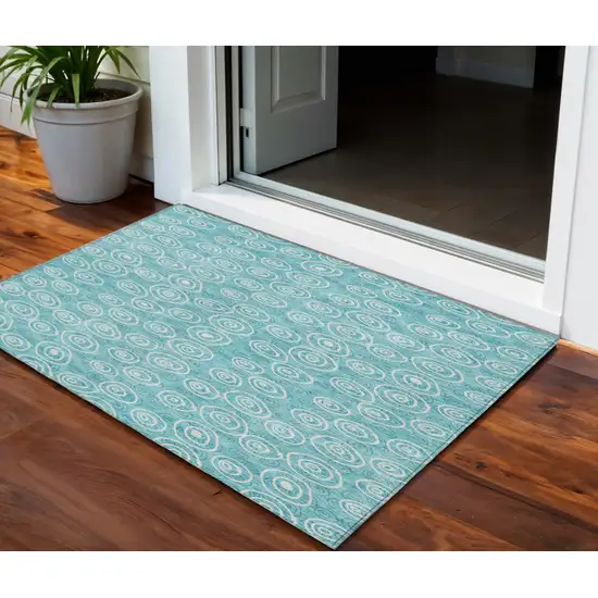 Teal Blue And Ivory Geometric Washable Indoor Outdoor Area Rug