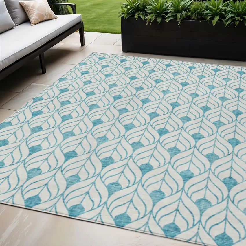 Teal Blue And Ivory Geometric Washable Indoor Outdoor Area Rug
