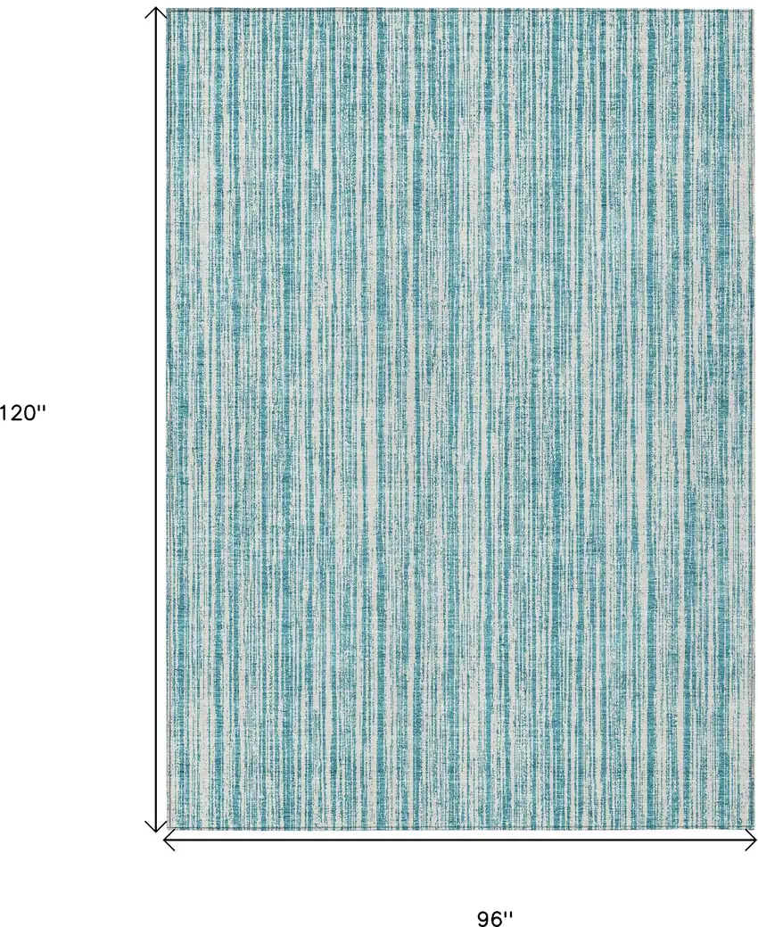 Add some artistry to your room with this 8-foot x 10-foot teal blue and ivory striped washable indoor outdoor area rug. This rectangle shaped rug features a striped design that will work well both indoors or out. A classic shape marries with good looking design for your living room, hall, bedroom, porch, patio, or poolside. Ideal for outdoor spaces or high traffic areas with kids and pets, this rug is made from heavy duty polyester that is stain resistant to help repel water, dirt, and stains. Versatile in use, durable, and easy to maintain, this rug is an ideal solution to add a decorative and inviting touch to your indoor or outdoor space. 96-inch h x 120-inch w x 0.19-inch d.