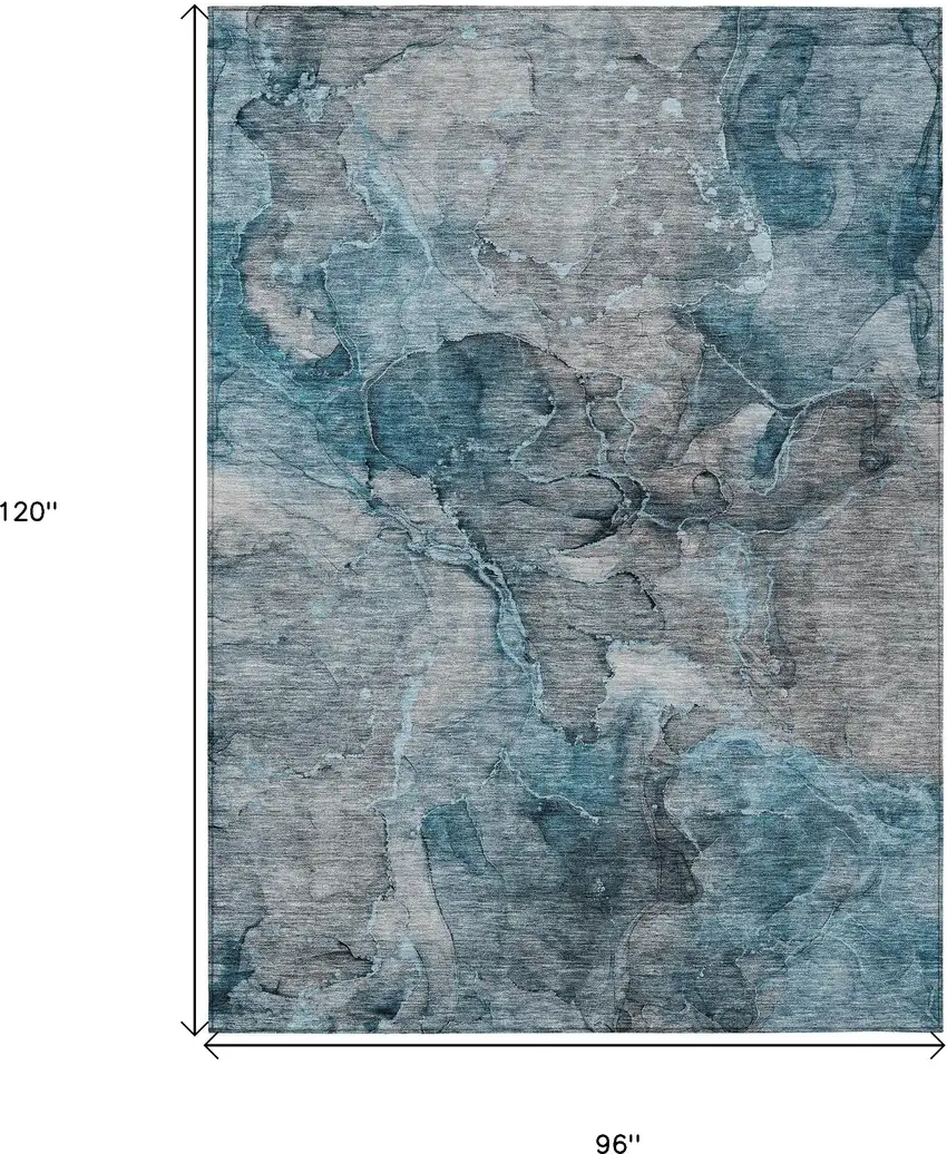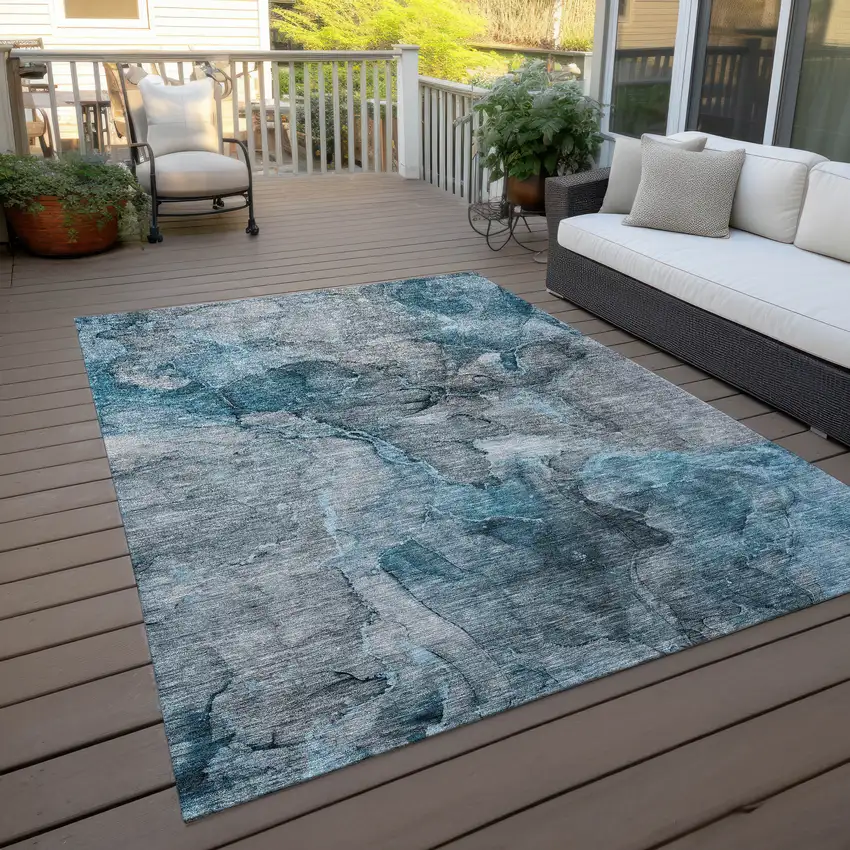 Teal Blue And Navy Blue Abstract Washable Indoor Outdoor Area Rug