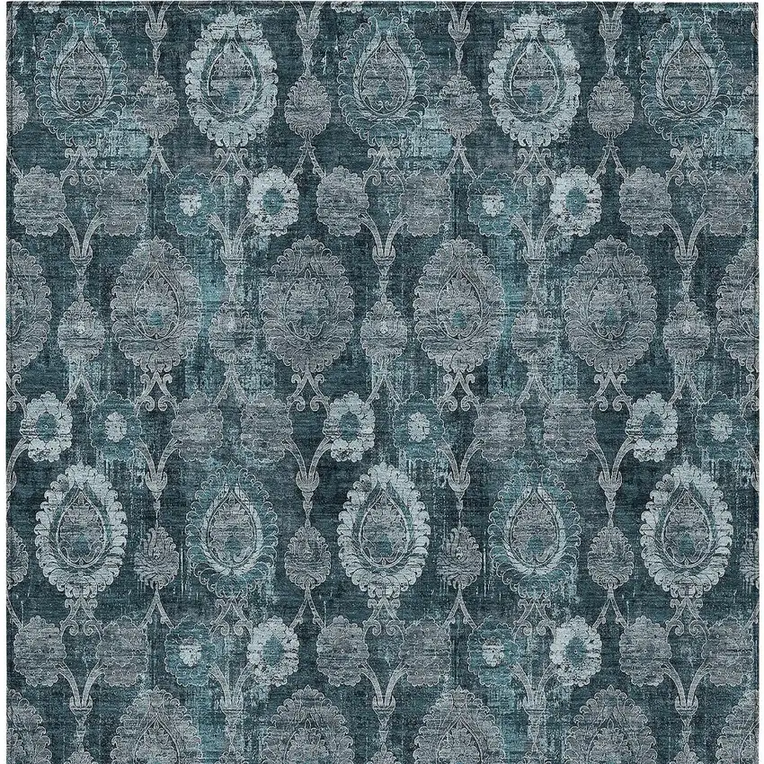 Teal Blue And Sky Blue Damask Washable Indoor Outdoor Area Rug