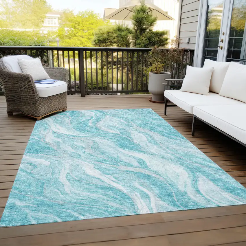 Teal Blue Aqua And Ivory Abstract Washable Indoor Outdoor Area Rug