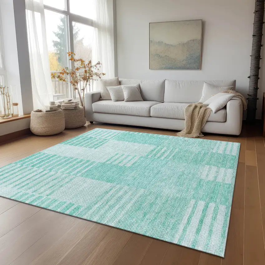Teal Blue Aqua And Ivory Striped Washable Indoor Outdoor Area Rug