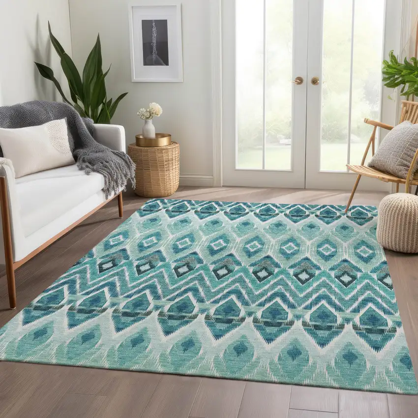 Set an inviting tone in your space with this 9-foot x 12-foot teal blue aqua and mint green southwestern washable indoor outdoor area rug. This rectangle shaped rug features a southwestern design that will work well both indoors or out. A classic shape marries with good looking design for your living room, hall, bedroom, porch, patio, or poolside. Ideal for outdoor spaces or high traffic areas with kids and pets, this rug is made from heavy duty polyester that is stain resistant to help repel water, dirt, and stains. Versatile in use, durable, and easy to maintain, this rug is an ideal solution to add a decorative and inviting touch to your indoor or outdoor space. 108-inch h x 144-inch w x 0.19-inch d.