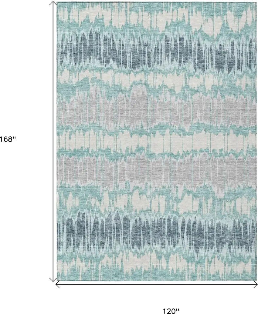 Set an inviting tone in your space with this 10-foot x 14-foot teal blue aqua and silver striped washable indoor outdoor area rug. This rectangle shaped rug features a striped design that will work well both indoors or out. A classic shape marries with good looking design for your living room, hall, bedroom, porch, patio, or poolside. Ideal for outdoor spaces or high traffic areas with kids and pets, this rug is made from heavy duty polyester that is stain resistant to help repel water, dirt, and stains. Versatile in use, durable, and easy to maintain, this rug is an ideal solution to add a decorative and inviting touch to your indoor or outdoor space. 120-inch h x 168-inch w x 0.19-inch d.