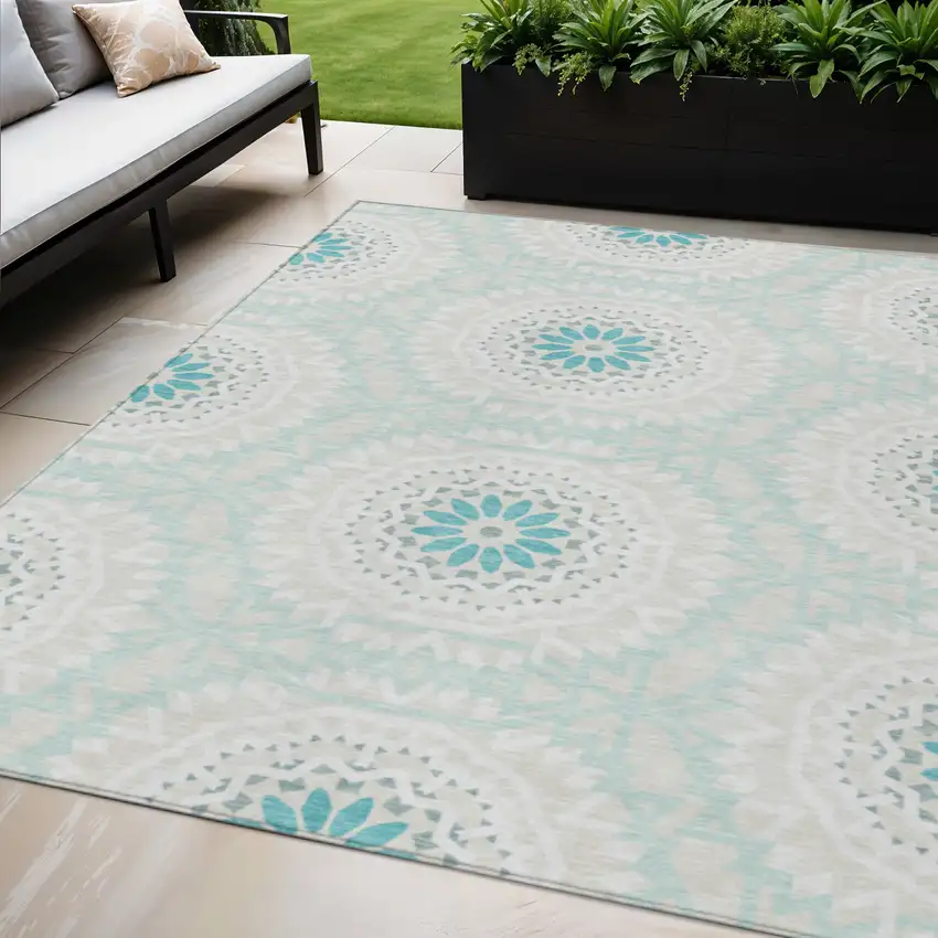 Teal Blue Beige And Ivory Floral Medallion Washable Indoor Outdoor Area Rug