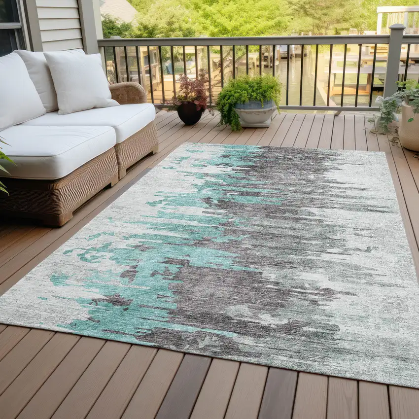 This 10-foot x 14-foot teal blue charcoal and silver abstract washable indoor outdoor area rug, is a great way to add warmth to a room. This rectangle shaped rug features a abstract design that will work well both indoors or out. A classic shape marries with good looking design for your living room, hall, bedroom, porch, patio, or poolside. Ideal for outdoor spaces or high traffic areas with kids and pets, this rug is made from heavy duty polyester that is stain resistant to help repel water, dirt, and stains. Versatile in use, durable, and easy to maintain, this rug is an ideal solution to add a decorative and inviting touch to your indoor or outdoor space. 120-inch h x 168-inch w x 0.19-inch d.