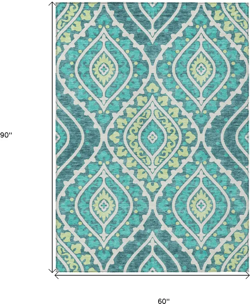 This 5-foot x 8-foot teal blue ivory and artichoke green floral washable indoor outdoor area rug, is a great way to add warmth to a room. This rectangle shaped rug features a floral design that will work well both indoors or out. A classic shape marries with good looking design for your living room, hall, bedroom, porch, patio, or poolside. Ideal for outdoor spaces or high traffic areas with kids and pets, this rug is made from heavy duty polyester that is stain resistant to help repel water, dirt, and stains. Makes a great way to dress up your patio, porch, or poolside, but also works well as a durable and easy to maintain option in the kitchen, family room, or mudroom. 60-inch h x 90-inch w x 0.19-inch d.