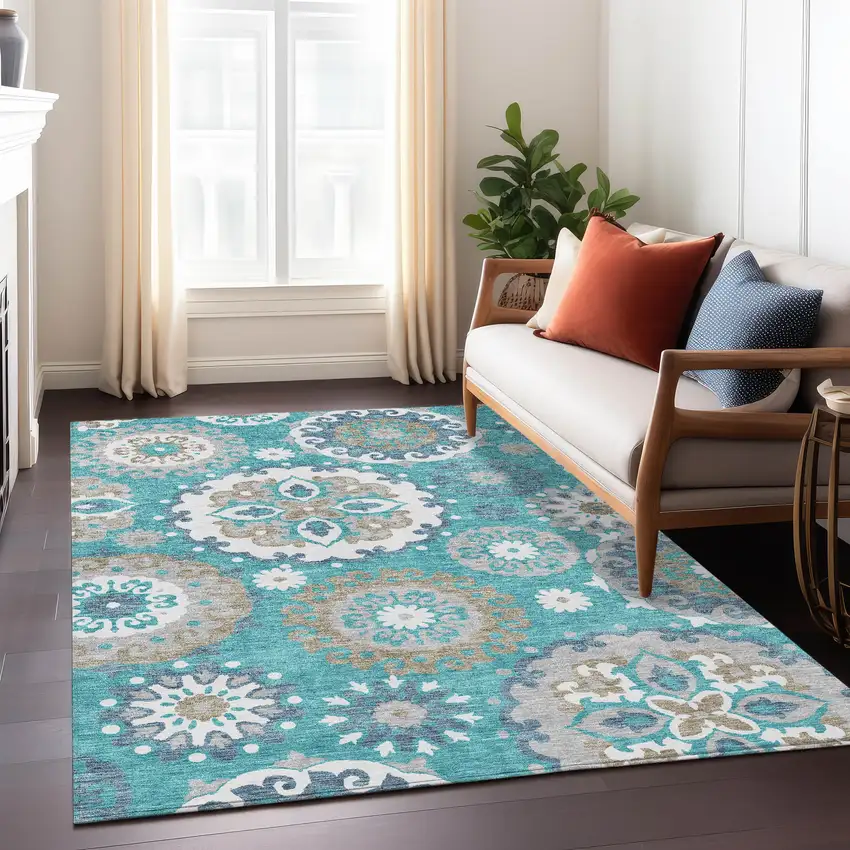 Set an inviting tone in your space with this 9-foot x 12-foot teal blue taupe and gray floral medallion washable indoor outdoor area rug. This rectangle shaped rug features a floral medallion design that will work well both indoors or out. A classic shape marries with good looking design for your living room, hall, bedroom, porch, patio, or poolside. Ideal for outdoor spaces or high traffic areas with kids and pets, this rug is made from heavy duty polyester that is stain resistant to help repel water, dirt, and stains. Versatile in use, durable, and easy to maintain, this rug is an ideal solution to add a decorative and inviting touch to your indoor or outdoor space. 108-inch h x 144-inch w x 0.19-inch d.