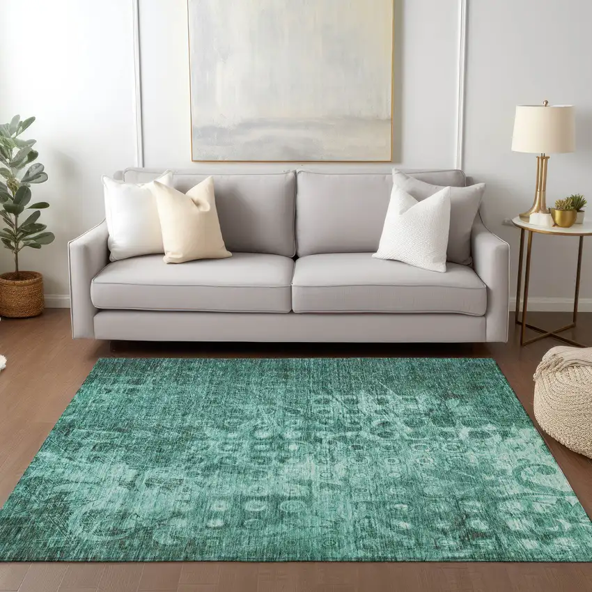 Add great coloration and comfortable texture to your space with this 9-foot x 12-foot teal ikat washable non skid indoor outdoor area rug. This rectangle shaped rug features a ikat design that will work well both indoors or out. A classic shape marries with good looking design for your living room, hall, bedroom, porch, patio, or poolside. Ideal for outdoor spaces or high traffic areas with kids and pets, this rug is made from heavy duty polyester that is stain resistant to help repel water, dirt, and stains. Versatile in use, durable, and easy to maintain, this rug is an ideal solution to add a decorative and inviting touch to your indoor or outdoor space. 108-inch h x 144-inch w x 0.19-inch d
