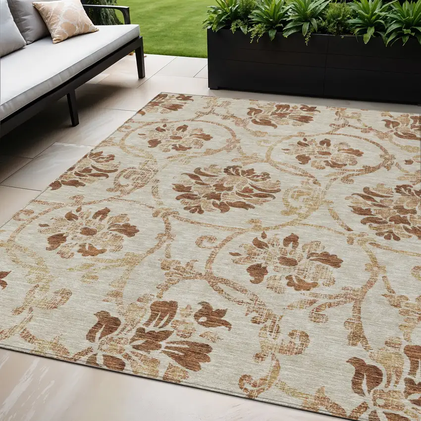 This 5-foot x 8-foot terra cotta copper and beige floral washable indoor outdoor area rug, is a great way to add warmth to a room. This rectangle shaped rug features a floral design that will work well both indoors or out. A classic shape marries with good looking design for your living room, hall, bedroom, porch, patio, or poolside. Ideal for outdoor spaces or high traffic areas with kids and pets, this rug is made from heavy duty polyester that is stain resistant to help repel water, dirt, and stains. Versatile in use, durable, and easy to maintain, this rug is an ideal solution to add a decorative and inviting touch to your indoor or outdoor space. 60-inch h x 90-inch w x 0.19-inch d.