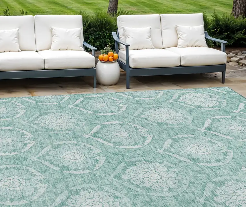Add some artistry to your room with this 10-foot x 14-foot turquoise teal blue and ivory medallion washable indoor outdoor area rug. This rectangle shaped rug features a medallion design that will work well both indoors or out. A classic shape marries with good looking design for your living room, hall, bedroom, porch, patio, or poolside. Ideal for outdoor spaces or high traffic areas with kids and pets, this rug is made from heavy duty polyester that is stain resistant to help repel water, dirt, and stains. Makes a great way to dress up your patio, porch, or poolside, but also works well as a durable and easy to maintain option in the kitchen, family room, or mudroom. 120-inch h x 168-inch w x 0.19-inch d.
