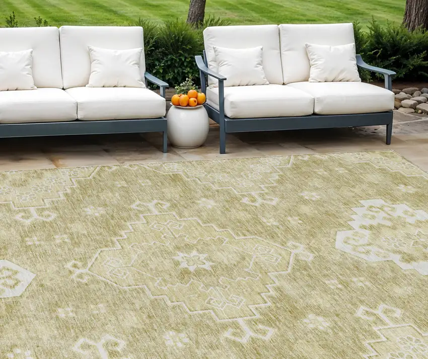 This 8-foot x 10-foot wheat gold and ivory medallion washable indoor outdoor area rug, is a great way to add warmth to a room. This rectangle shaped rug features a medallion design that will work well both indoors or out. A classic shape marries with good looking design for your living room, hall, bedroom, porch, patio, or poolside. Ideal for outdoor spaces or high traffic areas with kids and pets, this rug is made from heavy duty polyester that is stain resistant to help repel water, dirt, and stains. Makes a great way to dress up your patio, porch, or poolside, but also works well as a durable and easy to maintain option in the kitchen, family room, or mudroom. 96-inch h x 120-inch w x 0.19-inch d.