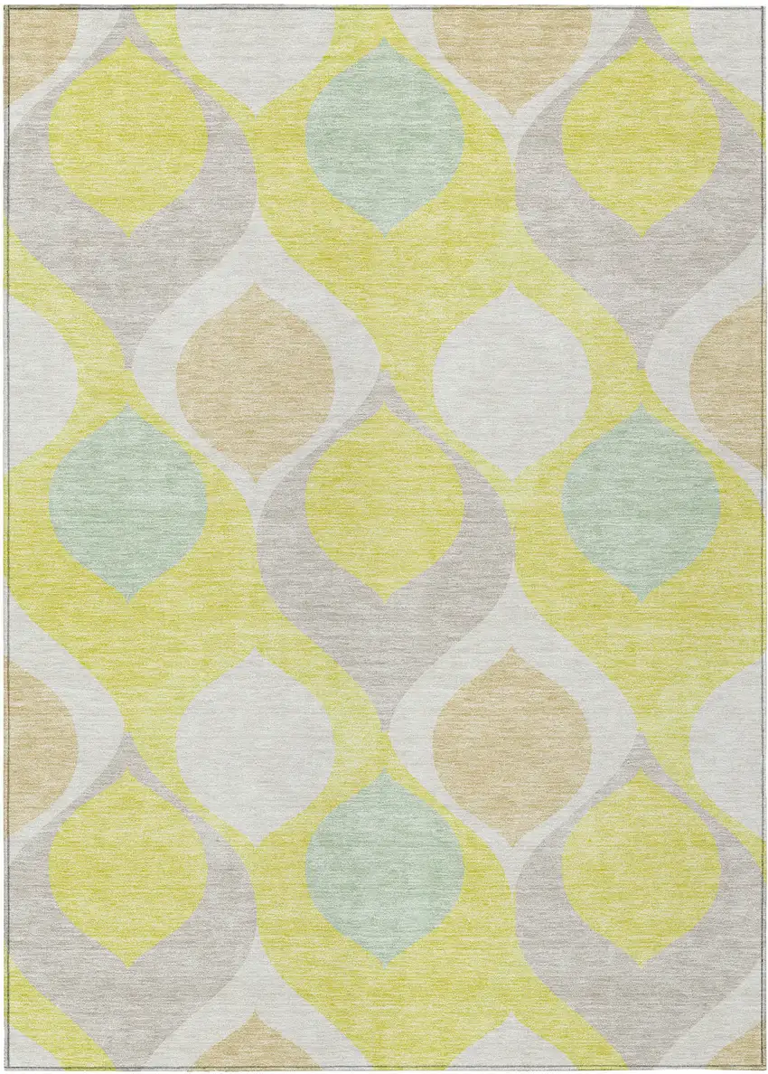 Add great coloration and comfortable texture to your space with this 9-foot x 12-foot yellow mint green and beige ogee washable indoor outdoor area rug. This rectangle shaped rug features a ogee design that will work well both indoors or out. A classic shape marries with good looking design for your living room, hall, bedroom, porch, patio, or poolside. Ideal for outdoor spaces or high traffic areas with kids and pets, this rug is made from heavy duty polyester that is stain resistant to help repel water, dirt, and stains. Versatile in use, durable, and easy to maintain, this rug is an ideal solution to add a decorative and inviting touch to your indoor or outdoor space. 108-inch h x 144-inch w x 0.19-inch d.