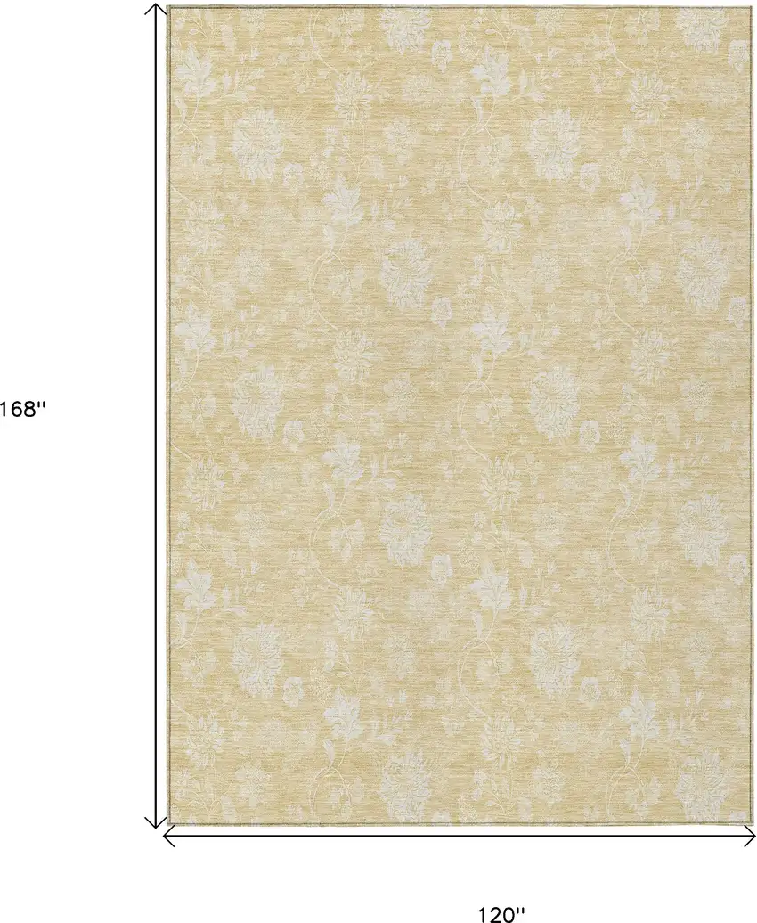 Add great coloration and comfortable texture to your space with this 10-foot x 14-foot yellow wheat and ivory floral washable indoor outdoor area rug. This rectangle shaped rug features a floral design that will work well both indoors or out. A classic shape marries with good looking design for your living room, hall, bedroom, porch, patio, or poolside. Ideal for outdoor spaces or high traffic areas with kids and pets, this rug is made from heavy duty polyester that is stain resistant to help repel water, dirt, and stains. Makes a great way to dress up your patio, porch, or poolside, but also works well as a durable and easy to maintain option in the kitchen, family room, or mudroom. 120-inch h x 168-inch w x 0.19-inch d.